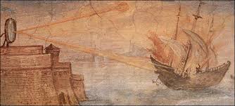The Heat Ray of Archimedes used highly polished bronze or copper shields that acted as mirrors to focus the sun's power on incoming enemy ships to set them on fire. He would have needed hundreds of copper shields, about three hundred to focus enough solar power, but with the king's ear who's to say he couldn't procure them. Many have tried this experiment and failed, like Mythbusters who tried and failed not once, but several times. Others have show that if the experiment is executed correctly, (like you will see at the bottom of #3) there is more than enough solar power focused to raise temperatures to 570 degrees Fahrenheit, the minimum temperature needed to set wood on fire. The trick is in the curvature of the reflective surface, like the first video at the top of this article shows, with the right curvature the death ray becomes a very powerful and dangerous weapon. The Solar II power plant near Barstow in California uses this same technology with 2,000 curved mirrors to reflect the heat of the sun back at it's solar receiver to make 10 megawatts of power a day. The electricity generated from all three of it's plants is enough to power more than 140,000 homes in California during peak hours. "Eureka!"